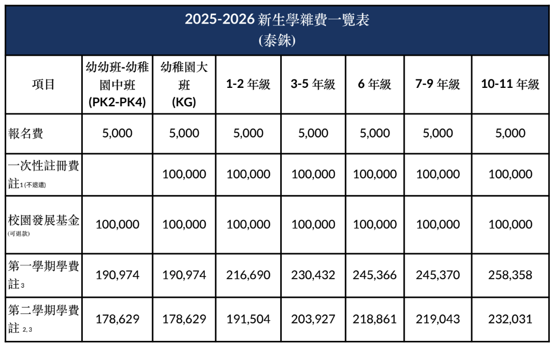 3 此費用不包含中文加強班 (CFB)、5-12年級英文加強班、英文密集班 (ELL、ELP)、教材、校外教學、畢業典禮、軍事訓練 (ROTC) 以及制服。